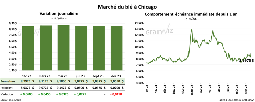 À Chicago, les contrats de blé aux échéances les plus rapprochées ont terminé la séance en progression entre 3 ¼ et 6 cents. À Kansas, ceux de blé dur rouge aux échéances les plus rapprochées ont également fini en hausse entre 3 ¾ et 4 cents. À Minneapolis, les contrats de blé de printemps ont fermé avec des gains entre 7 ¼ et 8 cents.