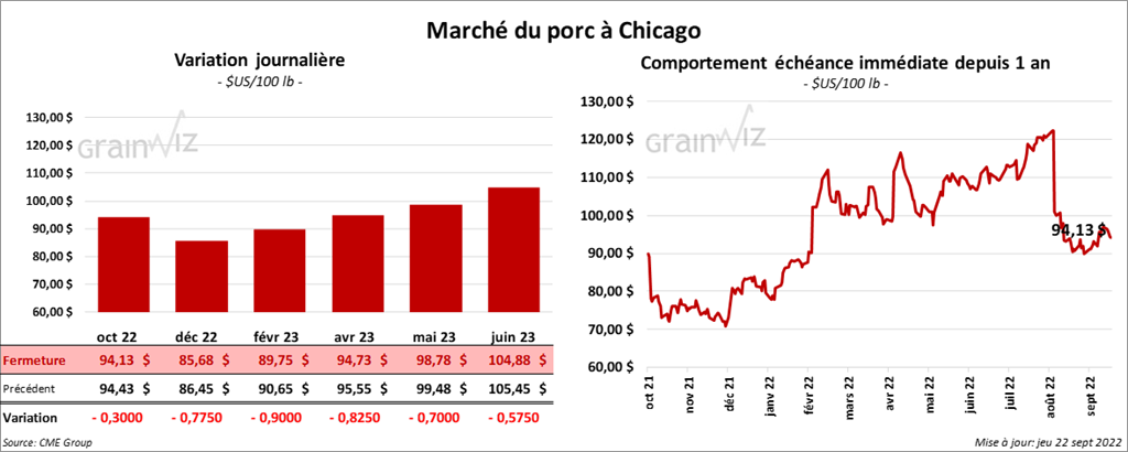 - Le 20 septembre dernier, le CME Lean Hog Index était en baisse de 40 cents à 97,96 $.