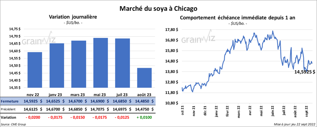 Les contrats de soya US aux échéances les plus rapprochées ont clôturé avec des pertes entre 1 ½ et 2 cents. Ceux de tourteau de soya US aux échéances les plus rapprochées ont également fermé dans le rouge entre 8,40 et 9,90 $/tonne. Les contrats d’huile de soya US aux échéances les plus rapprochées ont terminé la session en progression entre 146 et 160 points.