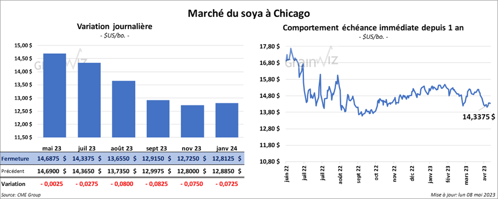 Les contrats de soya US aux échéances les plus rapprochées ont terminé la session en baisse entre ¼ et 8 cents. Ceux de tourteau de soya US ont fait l’inverse en fermant dans le vert entre 80 cents et 1,30 $/tonne. Celui mai 23 a fait exception en finissant dans en recul par 3,40 $/tonne. Les contrats d’huile de soya US aux échéances les plus rapprochées ont fermé avec des pertes entre 68 et 75 cents.