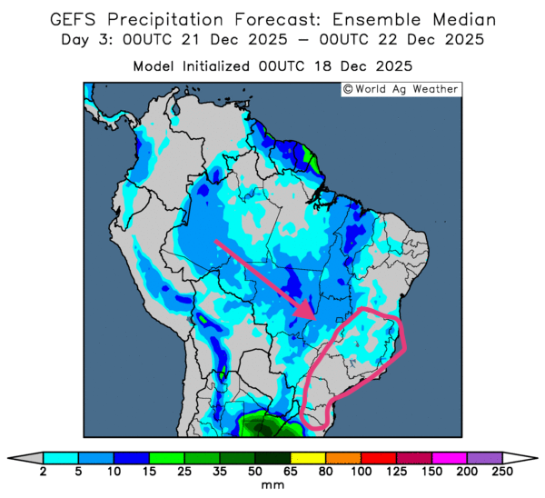 - Dans l'ensemble, les prévisions météo pour le Brésil semblent favorables à court terme. L'analyse des cartes du Brésil GFS, fournies par World Ag Weather et dessinées jusqu'au 3e jour, révèle surtout des possibilités de pluies plus ou moins abondantes pour le centre du pays. Comme le montre la carte du 3e jour ci-contre, des précipitations variables pourraient affecter le centre et certaines parties de l'est du pays. Toutefois, les météorologues laissent entrevoir un temps sec persistant pour les régions du sud-est, de l'État de São Paulo jusqu'à celui de Santa Catarina.