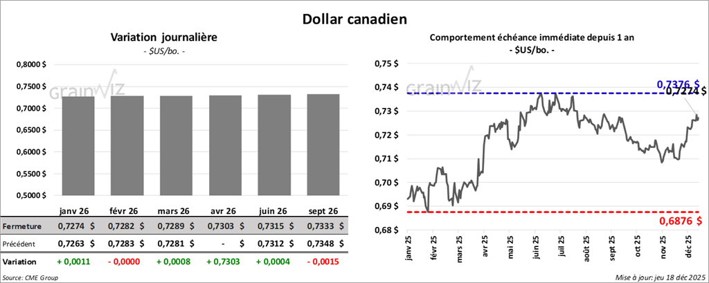 Du côté de l'huile de soya américaine, le contrat janvier 26 a terminé à 48,11 $ (-41 points). Celui mars 26 a fini à 48,62 $ (-43 points).