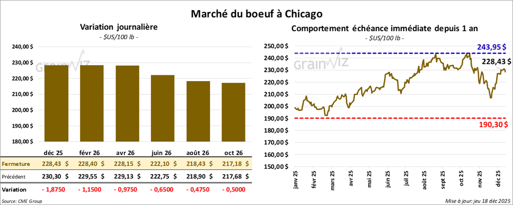 Le contrat de bœuf américain décembre 25 a clôturé à 228,43 $ (-1,88 $). Celui février 26 a fermé à 228,40 $ (-1,15 $). Celui avril 26 a terminé à 228,15 $ (-98 cents).