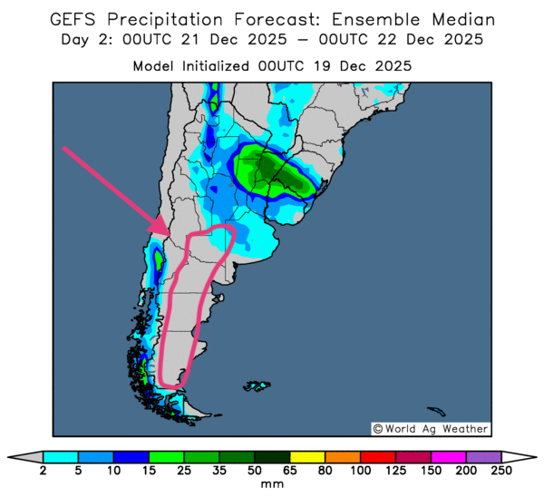 - Dans l’ensemble, les prévisions météo pour l’Argentine s’améliorent, du moins à court terme. L’analyse des cartes de l’Argentine GFS, fournies par World Ag Weather et illustrées jusqu’au 3e jour, indique notamment des possibilités de pluies variables pour le nord et le centre-est du pays. Toutefois, comme le montre la carte 2e jour présentée ci-dessous, un manque probable de précipitations est à prévoir pour la province de La Pampa et celles situées plus au sud.