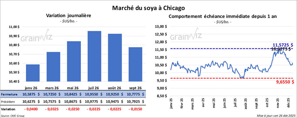 Le contrat de soya américain janvier 26 a clôturé à 10,5975 $ (- 4 cents). Celui mars 26 a fermé à 10,7350 $ (- 3 ¼ cents). Celui mai 26 a terminé à 10, 8500 $ (- 2 ½ cents).