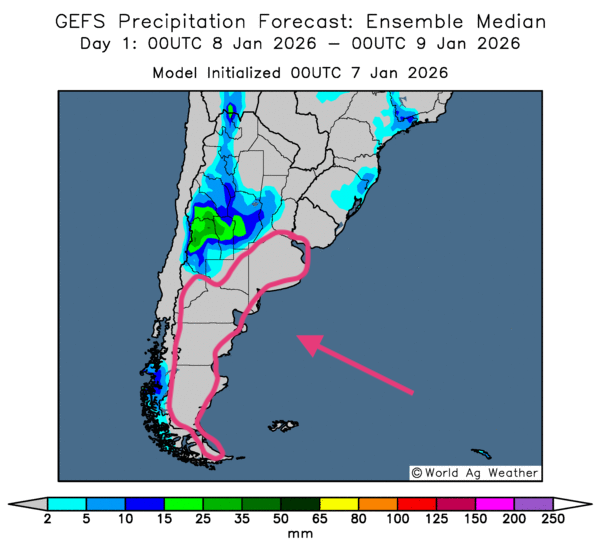 - De son côté, World Weather mentionne que le centre de l’Argentine pourrait recevoir des pluies au cours des prochains jours, et même jusqu’au week-end. En revanche, une partie de la province de Buenos Aires pourrait rester au sec. L’organisme estime qu’à plus long terme, les précipitations pourraient être insuffisantes pour limiter le potentiel de stress hydrique dans le centre du pays. Il précise enfin que le sud de l’Argentine pourrait composer avec une sécheresse persistante.