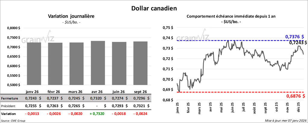 Le contrat de soya américain janvier 26 a clôturé à 10,5275 $ (+ 10 ¾ cents). Celui mars 26 a fermé à 10,6700 $ (+ 10 ¾ cents). Celui mai 26 a terminé à 10,7875 $ (+10 ¾ cents).