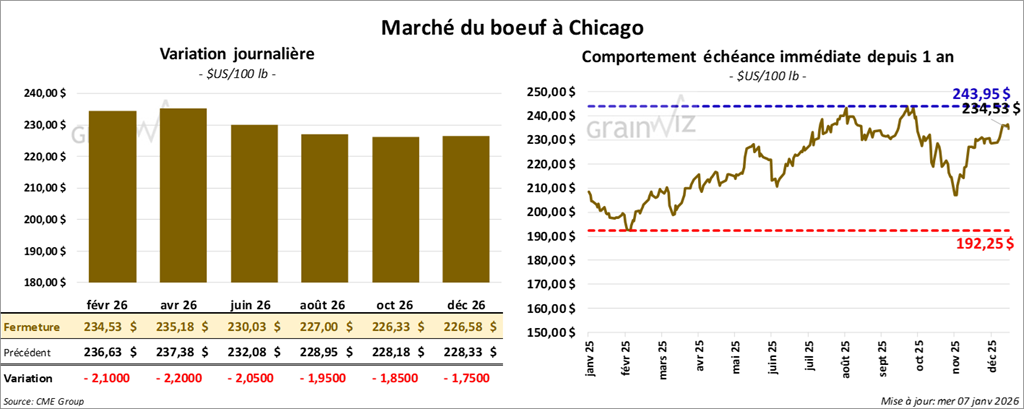 Le contrat de bœuf américain février 26 a clôturé à 234,53 $ (-2,10 $). Celui avril 26 a fermé à 235,18 $ (-2,20 $). Celui juin 26 a terminé à 230,03 $ (-2,05 $).