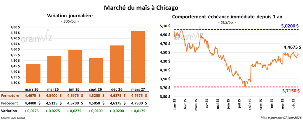 Le contrat de maïs américain mars 26 a clôturé à 4,4675 $ (+ 2 ¾ cents). Celui mai 26 a fermé à 4,5400 $ (+ 2 ¾ cents). Celui juillet 26 a terminé à 4,5975 $ (+ 2 ¾ cents).