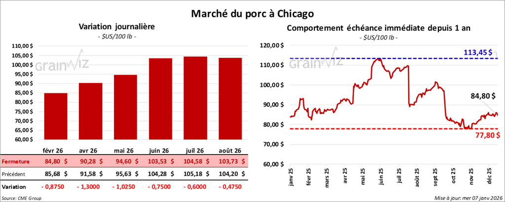 Le contrat de porc américain février 26 a clôturé à 84,80 $ (-88 cents). Celui avril 26 a fermé à 90,28 $ (-1,30 $). Celui mai 26 terminé à 94,60 $ (-1,03 $).