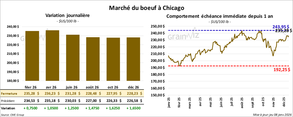 Le contrat de bœuf américain février 26 a clôturé à 235,28 $ (+ 75 cents). Celui avril 26 a fermé à 236,23 $ (+ 1,05 $). Celui juin 26 a terminé à 231,28 $ (+ 1,25 $).