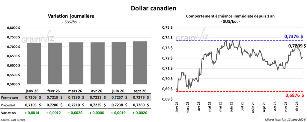 Le contrat de soya américain janvier 26 a clôturé à 10,3300 $ (- 15 ½ cents). Celui mars 26 a fermé à 10,4900 $ (- 13 ½ cents). Celui mai 26 a terminé à 10,6175 $ (- 12 ¾ cents).