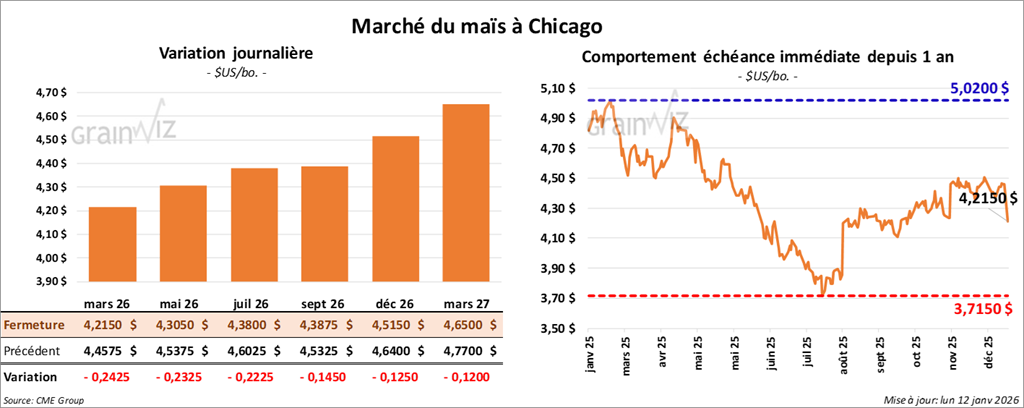 Le contrat de maïs américain mars 26 a clôturé à 4,2150 $ (- 24 ¼ cents). Celui mai 26 a fermé à 4,3050 $ (- 23 ¼ cents). Celui juillet 28 a terminé à 4,3800 $ (- 22 ¼ cents).