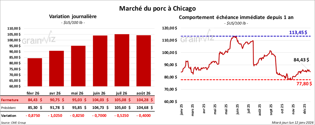 Le contrat de porc américain février 26 a clôturé à 84,43 $ (- 88 cents). Celui avril 26 a fermé à 90,75 $ (- 1,03 $). Celui mai 26 a terminé à 95,03 $ (- 83 cents).