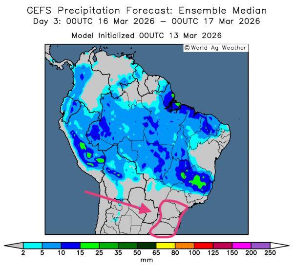 - Dans l’ensemble, les prévisions météorologiques à court terme changent peu pour le Brésil. L’analyse des cartes GFS (World Ag Weather) illustrées jusqu’au 3e jour laisse entrevoir des pluies un peu moins abondantes dans le centre, le nord et certaines parties de l’Est. Ailleurs, dans le sud, le temps sec pourrait persister, surtout dans le sud-est, à la hauteur du Rio Grande do Sul et même plus au nord, dans les environs du Paraná. Cette sécheresse, qui perdure depuis un certain temps, entraîne un stress hydrique constant pour différentes cultures (voir notamment la carte du 3e jour ci-contre).