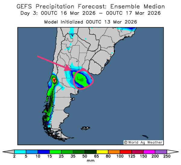 - Dans l’ensemble, les prévisions météorologiques à court terme s’améliorent pour l’Argentine. L’analyse des cartes GFS (World Ag Weather) illustrées jusqu’au 3e jour laisse entrevoir des possibilités de pluie et d’ensoleillement dans le nord, le centre et l’est du territoire. Comme l’illustre cette carte du 3e jour ci-contre, les régions asséchées de l’est, dans les environs de la province de Buenos Aires, pourraient recevoir des pluies parfois fortes, mais bénéfiques. Par contre, les secteurs du sud, au-delà de la province de La Pampa, pourraient être touchés par un temps sec persistant, ce qui accentuerait le stress hydrique sur plusieurs cultures.
