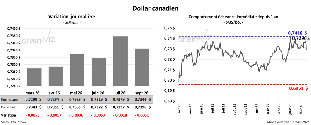 Du côté de l’huile de soya américaine, le contrat de mai 26 a terminé à 67,44 $ (+ 2 points). Celui de juillet 26 a fini à 67,12 $ (0,0).