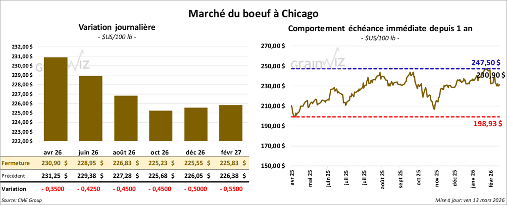 Le contrat de bœuf américain avril 26 a clôturé à 230,90 $ (- 35 cents). Celui de juin 26 a fermé à 228,95 $ (- 43 cents). Celui d’août 26 a terminé à 226,83 $ (- 45 cents).
