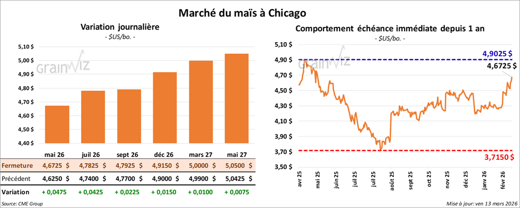 Le contrat de maïs américain mai 26 a clôturé à 4,6725 $ (+ 4 ¾ cents). Celui de juillet 26 a fermé à 4,7825 $ (+ 4 ¾ cents). Celui de septembre 26 a terminé à 4,7925 $ (+ 2 ¼ cents).