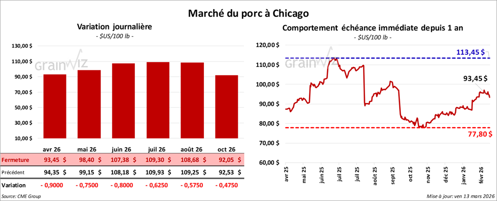 Le contrat de porc américain avril 26 a clôturé à 93,45 $ (- 90 cents). Celui de mai 26 a fermé à 98,40 $ (- 75 cents). Celui de juin 26 a terminé à 107,38 $ (- 80 cents).