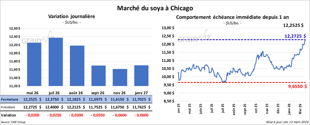 Le contrat de soya américain mai 26 a clôturé à 12,2525 $ (- 2 cents). Le contrat de juillet 26 a fermé à 12,3750 $ (- 2 ½ cents). Celui d’août 26 a terminé à 12,1825 $ (- 3 cents).