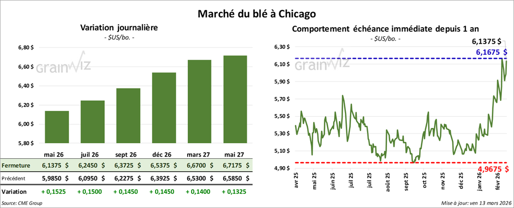 À Chicago, le contrat de blé de mai 26 a clôturé à 6,1375 $ (+ 15 ¼ cents). Celui de juillet 26 a fermé à 6,2450 $ (+ 15 cents). Celui de septembre 26 a terminé à 6,3725 $ (+ 14 ½ cents).