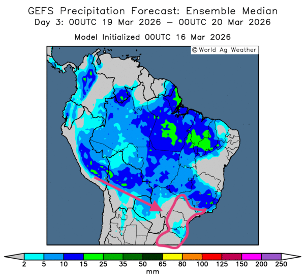 - Globalement, peu de changements à court terme se dessinent dans les prévisions météorologiques pour le Brésil. L’analyse des cartes GFS (World Ag Weather) jusqu’au 3e jour indique des possibilités de pluie, plus ou moins abondantes, pour le nord, le centre, l’est et certaines parties de l’Est. Quant au sud, un temps sec pourrait se profiler, surtout du Rio Grande do Sul jusqu’au São Paulo, plus au nord (voir notamment la carte du 3e jour ci-contre).