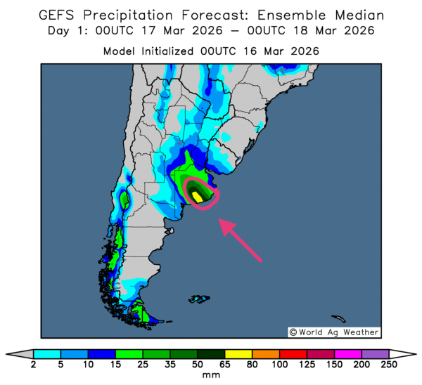 - Essentiellement, des améliorations dans les prévisions météorologiques sont perceptibles pour l’Argentine, du moins à court terme. L’analyse des cartes GFS (World Ag Weather) illustrées jusqu’au 3e jour montre notamment des possibilités de pluie pour les secteurs asséchés de l’Est de l’Argentine. Comme le montre cette carte dessinée pour demain, des précipitations plus ou moins abondantes, mais relativement bénéfiques, pourraient survenir dans la province de Buenos Aires et ses environs, plus à l’ouest. Toutefois, des risques d’inondations demeurent possibles dans l’extrême est de cette province.