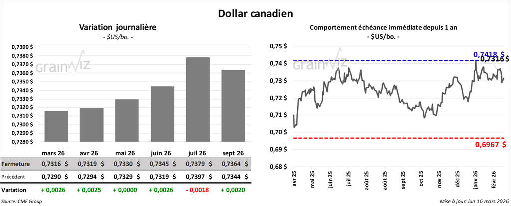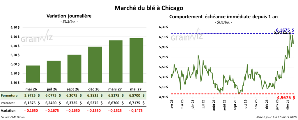 À Chicago, le contrat de blé mai 26 a clôturé à 5,9725 $ (-16 ½ cents). Celui juillet 26 a fermé à 6,0775 $ (- 16 ¾ cents). Celui septembre 26 a terminé à 6,2075 $ (- 16 ½ cents).
