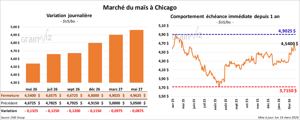 Le contrat de maïs mai 26 a clôturé à 4,5400 $ (- 13 ¼ cents). Celui juillet 26 a fermé à 4,6575 $ (- 12 ½ cents). Celui septembre 26 a terminé à 4,6725 $ (- 12 cents).