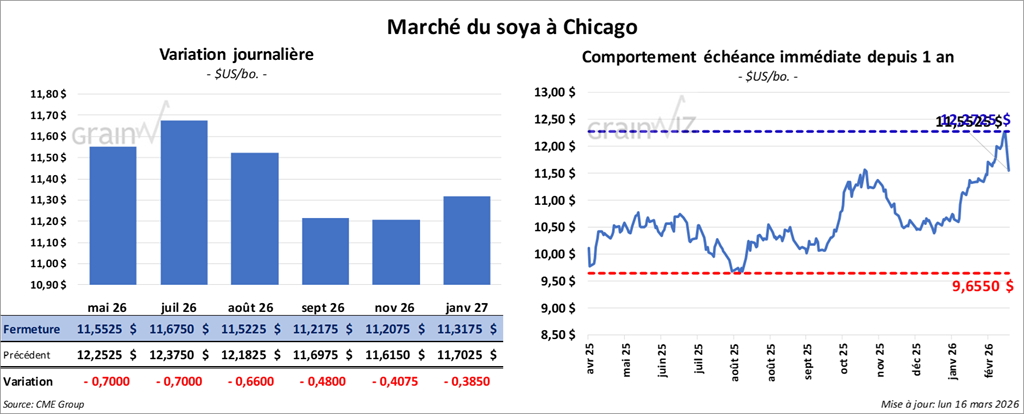 Le contrat de soya américain mai 26 a clôturé à 11,5525 $ (-70 cents). Celui juillet 26 a fermé à 11,6750 $ (-70 cents). Celui août 26 a terminé à 11,5225 $ (- 66 cents).