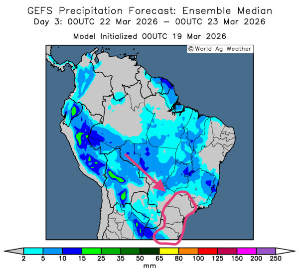 - Globalement, certains changements se dessinent dans les prévisions météorologiques à court terme pour le Brésil. L’analyse des cartes GFS (World Ag Weather), illustrées jusqu’au 3e jour, indique notamment un recul des possibilités de pluie pour le centre, le Nord et certaines parties de l’Est. Toutefois, des conditions encore plus sèches demeurent possibles dans le sud, plus particulièrement dans le sud-est, aux environs de l’État de São Paulo, jusque dans l’extrême sud, vers le Rio Grande do Sul (voir notamment la carte du 3e jour ci-contre).