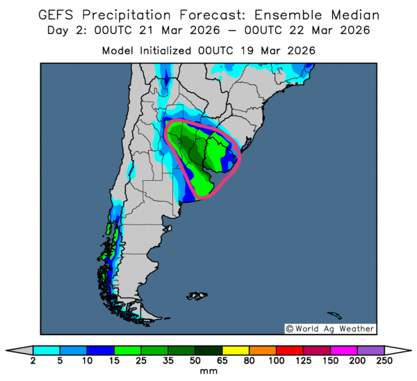 - Essentiellement, les prévisions météorologiques à court terme continuent de s’améliorer pour l’Argentine. L’analyse des cartes GFS (World Ag Weather), tracées jusqu’au 3e jour, révèle des possibilités de pluie pour le nord, le centre et certaines parties du sud. Toutefois, comme l’illustre la carte du 2e jour ci-contre, des averses abondantes pourraient toucher l’Est et certaines parties du centre. Dans certains cas, notamment dans la province de Buenos Aires, des inondations localisées pourraient survenir.