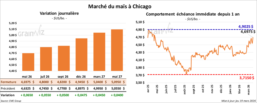 Le contrat de maïs américain mai 26 a clôturé à 4,6975 $ (+ 6 ½ cents). Celui juillet 26 a fermé à 4,8000 $ (+ 5 ½ cents). Celui septembre 26 a terminé à 4,8200 $ (+ 5 cents).