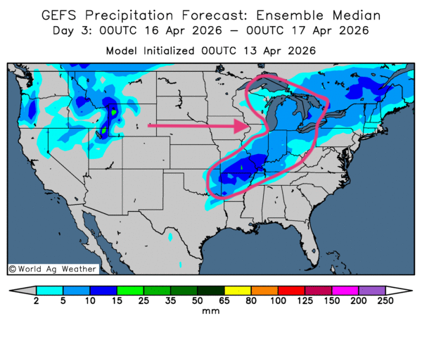 - Essentiellement, les prévisions météorologiques à court terme demeurent favorables pour une bonne partie des États-Unis. L’analyse des cartes GFS (World Ag Weather) fait surtout ressortir des possibilités de pluie autour des Grands Lacs. Ces précipitations pourraient même s’étirer vers le sud-ouest, jusque dans le Missouri et l’Arkansas (voir notamment la carte du 3e jour, ci-contre). Il manque toutefois encore d’averses dans le nord et certaines portions du centre des Plaines américaines. Le Sud-Est américain affiche également un déficit de précipitations, malgré des besoins bien présents.