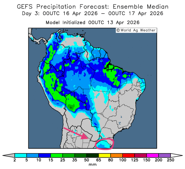 - Globalement, les conditions météorologiques évoluent correctement à court terme au Brésil. L’analyse des cartes GFS (World Ag Weather), illustrées jusqu’au 3e jour, montre un assèchement généralisé, mais favorable, à l’échelle des régions productrices. Comme l’indique toutefois la carte du 3e jour, des précipitations demeurent possibles dans l’extrême sud-est, soit au Rio Grande do Sul. En revanche, un déficit de pluie pourrait s’installer dans les autres secteurs du Sud brésilien.