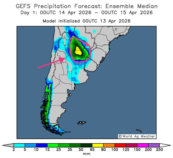 - Dans l’ensemble, les prévisions météorologiques à court terme sont favorables pour l’Argentine. L’analyse des cartes GFS (World Ag Weather), tracées jusqu’au 3e jour, signale des possibilités de pluie sur le nord et certaines portions du centre du pays. Les provinces de Santa Fe, du Chaco, de Santiago del Estero et de Corrientes pourraient même recevoir des précipitations abondantes, au point de causer des inondations localisées (voir la carte de demain, ci-contre). Des averses additionnelles resteront toutefois nécessaires dans les régions plus au sud, notamment dans la province de La Pampa.