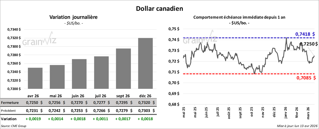 Du côté de l’huile de soya américaine, le contrat mai 26 a terminé à 65,50 $ (-59 points). Celui juillet 26 a fini à 66,36 $ (-66 points).