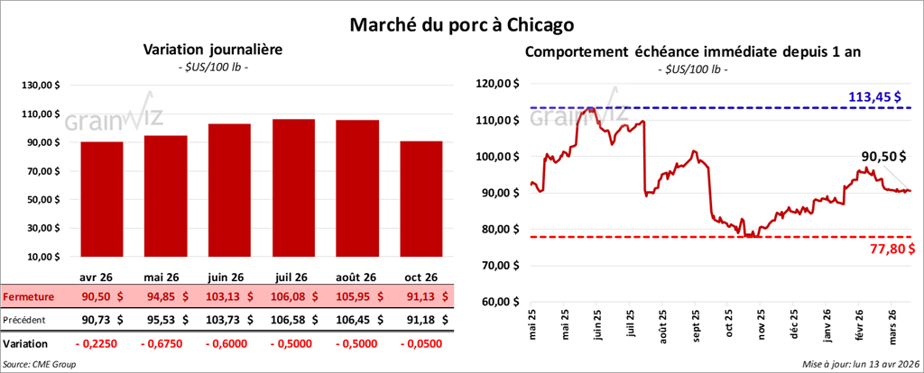 Le contrat de porc américain mai 26 a clôturé à 94,85 $ (-68 cents). Celui juin 26 a fermé à 103,13 $ (-60 cents). Celui juillet 26 a terminé à 106,08 $ (-50 cents).