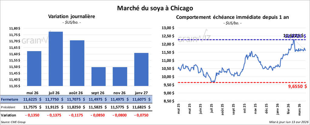 Le contrat de soya américain mai 26 a clôturé à 11,6225 $ (-13 ½ cents). Celui juillet 26 a fermé à 11,7750 $ (-13 ¾ cents). Celui août 26 a terminé à 11,7075 $ (-11 ¾ cents).