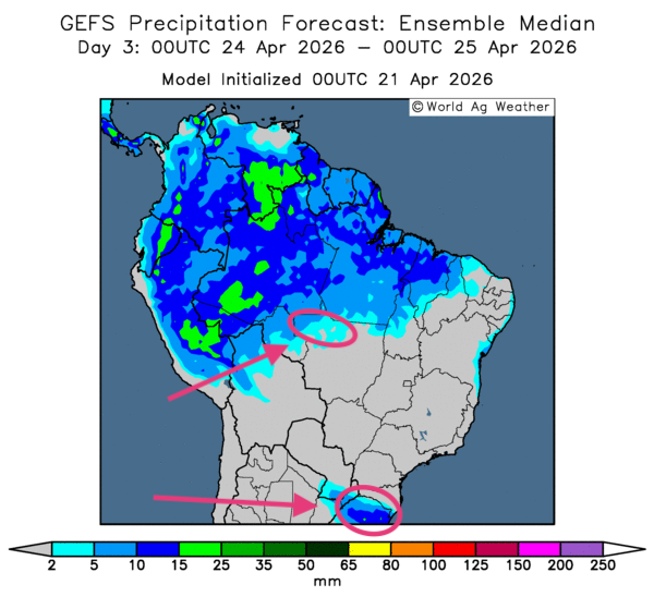 - Globalement, peu de changements sont attendus à court terme dans les prévisions météorologiques pour le Brésil. L’analyse des cartes GFS (World Ag Weather) illustrées jusqu’au 3e jour révèle des possibilités de temps sec favorables pour la majorité des régions productrices du Brésil. Toutefois, comme le montre cette carte du 3e jour ci-contre, seul l’extrême ouest du Mato Grosso, dans le centre-ouest du Brésil, ainsi que la majeure partie du Rio Grande do Sul, situé à l’extrême sud-est du pays, pourraient recevoir des précipitations plus ou moins abondantes.