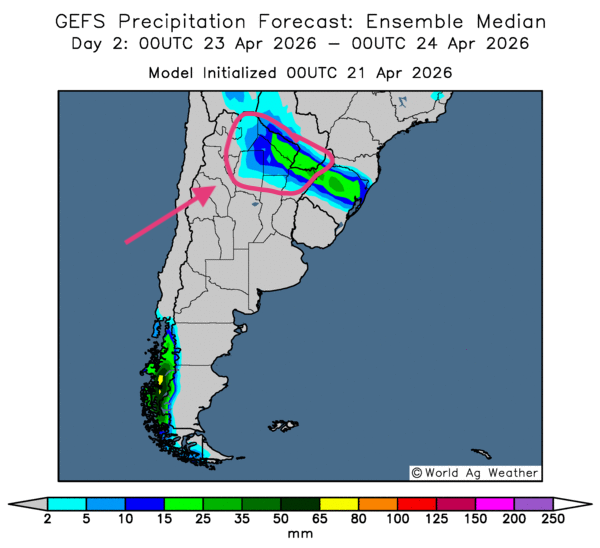 - Essentiellement, les prévisions météorologiques demeurent correctes à court terme pour une bonne partie de l’Argentine. L’analyse des cartes GFS (World Ag Weather) illustrées jusqu’au 3e jour indique des probabilités de temps sec pour la majeure partie du territoire. Toutefois, des précipitations restent possibles dans le nord du pays, comme le montre cette carte tracée pour le 2e jour.