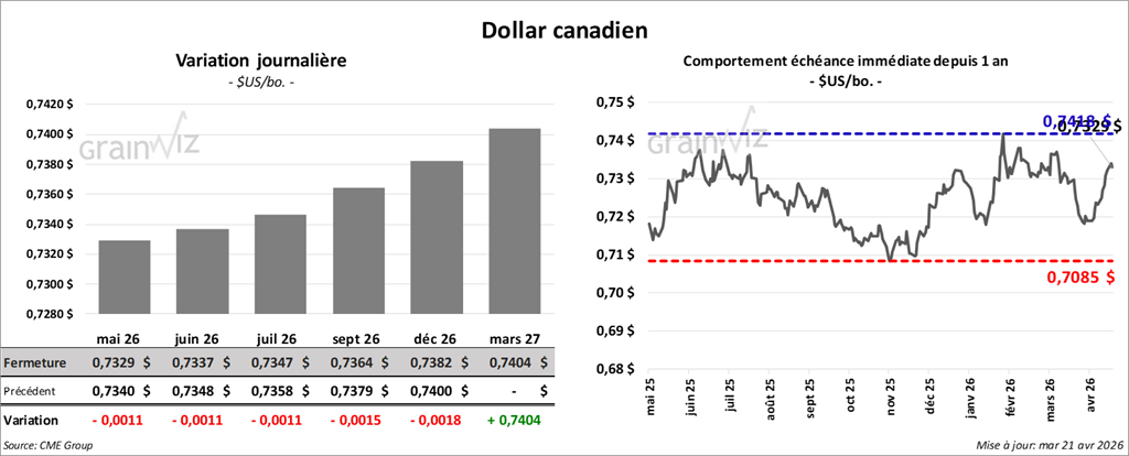 Du côté de l’huile de soya américaine, le contrat de mai 26 a terminé à 72,14 $ (+ 251 points). Celui de juillet 26 a fini à 71,65 $ (+ 235 points).