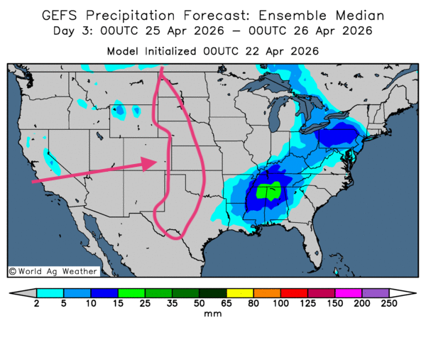 - De manière générale, les conditions météorologiques semblent favorables à court terme pour les États-Unis. L’analyse des cartes GFS (World Ag Weather), tracées jusqu’au 3e jour, montre notamment de bonnes possibilités d’alternance entre pluie et ensoleillement à l’échelle du Midwest et de plusieurs régions des Plaines. Toutefois, comme l’indique la carte du 3e jour ci-contre, la sécheresse dans l’ouest des Plaines risque de perdurer encore un certain temps.