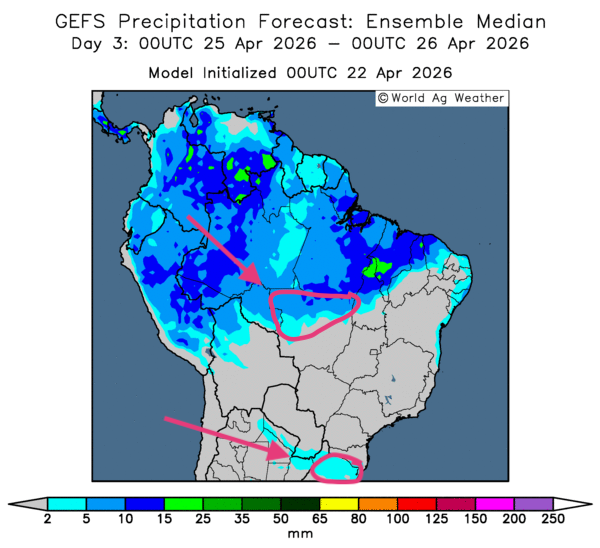 - Dans le cas de l’Argentine, World Weather mentionne que les conditions sont particulièrement humides à plusieurs endroits. Toutefois, l’organisme estime que le temps sec prévu au cours des prochains jours pourrait améliorer la situation de la plupart des cultures.
