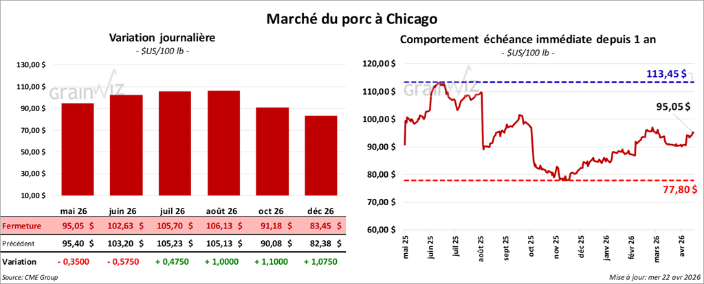 Le contrat de porc américain mai 26 a clôturé à 95,05 $ (- 35 cents). Celui de juin 26 a fermé à 102,63 $ (- 58 cents). Celui de juillet 26 a terminé à 105,70 $ (+ 48 cents).