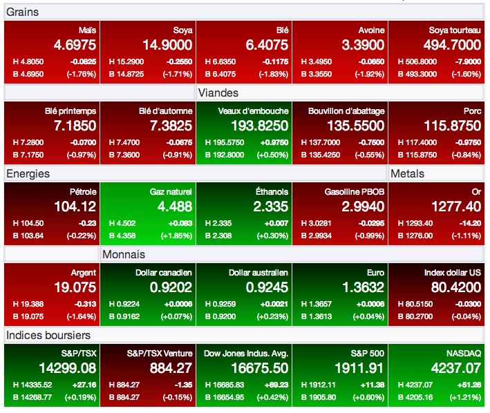 Sur le contrat à terme pour livraison immédiate (juillet 14), il a reculé de -0,0825 à 4,6975 $US/boisseau (-3,25 à 185 $US/tonne), sa fermeture journalière la plus basse depuis le début du mois de mars dernier. Sur le contrat à terme de la prochaine récolte (décembre 14), il a perdu -0,0950 à 4,6575 $US/boisseau (-3,74 à 183 $US/tonne), soit dans ce cas-ci sa fermeture la plus faible depuis la fin février.