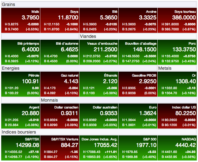 Rebond intéressant dans le marché du soya aujourd’hui, particulièrement celui de la prochaine récolte (novembre 14) qui a gagné +0,1125 à 10,8625 $US/boisseau. La progression sur le contrat à terme de l’ancienne récolte (août 14) a été plus modérée avec un léger gain de +0,0125 à 11,97 $US/boisseau.