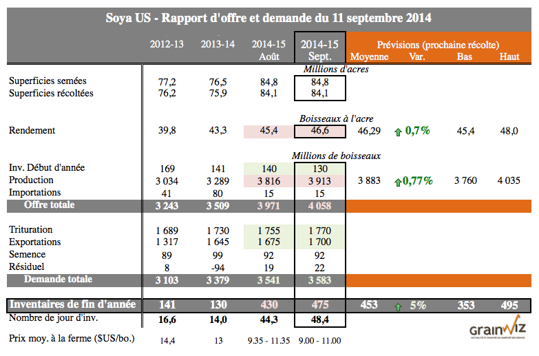 - Supporté par la faiblesse du prix, le USDA s’attend à une meilleure consommation (trituration) et de meilleures exportations en 2014-15.