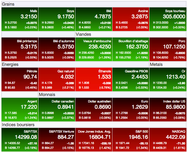 - Blé – Tout comme pour le maïs, le USDA a révélé des stocks de blé aux États-Unis au 1er septembre à 1,914 milliard de boisseaux, ce qui est plus que ce que les marchés prévoyaient (1,880 milliard de boisseaux), rien pour aider les prix déjà très malmenés par l’abondance de blé prévu pour 2014-15.